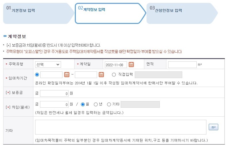 다음 단계에서는 계약 정보를 입력해야 합니다. 임대차 기간, 보증금, 면적, 계약일 및 주택 유형을 작성해주세요. 월세인 경우에는 월세 금액도 입력해야 합니다.