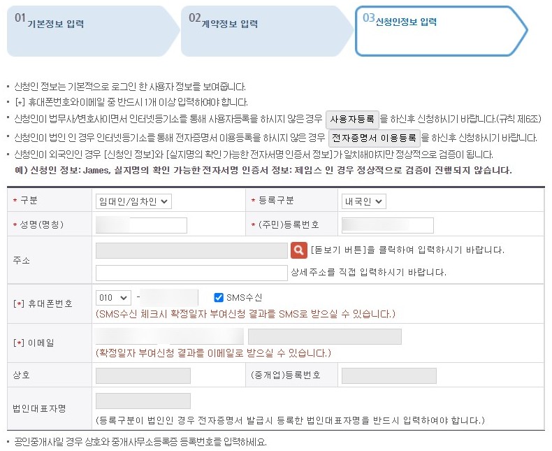 신청인 정보를 입력할 때, 임대인과 임차인을 선택하여 성명, 주민등록번호, 주소를 작성하고, 반드시 휴대폰번호 또는 이메일 중 최소한 하나를 입력해야 합니다.