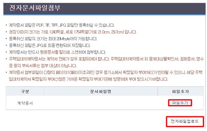 이제 임대차 계약서를 첨부해야 합니다. 계약서 파일은 pdf, jpg, tf, tiff 형식만 등록할 수 있으며, 권장 크기는 가로 1240픽셀, 세로 1745픽셀입니다. 파일추가를 클릭하여 전자파일업로드 합니다.