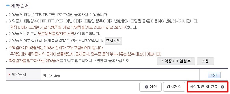 파일을 업로드한 후에는 작성 내용을 확인하고 "작성 확인 및 완료" 버튼을 클릭합니다.