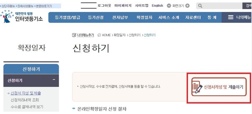 보안 프로그램 설치가 완료되었다면, 이제 대법원 인터넷등기소 사이트에서 확정일자를 신청할 수 있습니다. 메뉴 확정일자 페이지에서 "신청하기"를 클릭합니다. "신청서 작성 및 제출"을 선택하면 해당 신청서 작성화면으로 이동합니다.