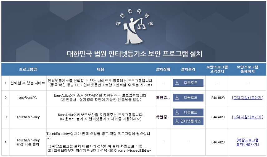 "대법원 인터넷등기소에 처음 접속하시는 분들은 보안 프로그램이 설치되지 않았습니다. 아래 안내 페이지로 이동하여 보안프로그램을 다운로드하고 설치해주시기 바랍니다."