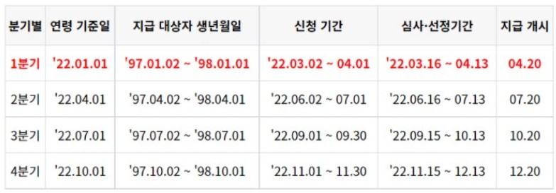 2022년 경우 1분기는 2022년 3월 2일부터 4월 1일, 2분기는 2022년 6월 2일부터 7월 1일까지, 3분기는 2022년 9월 1일부터 9월 30일까지, 4분기는 2022년 11월 1일부터 11월 30일까지 신청기간이었습니다.