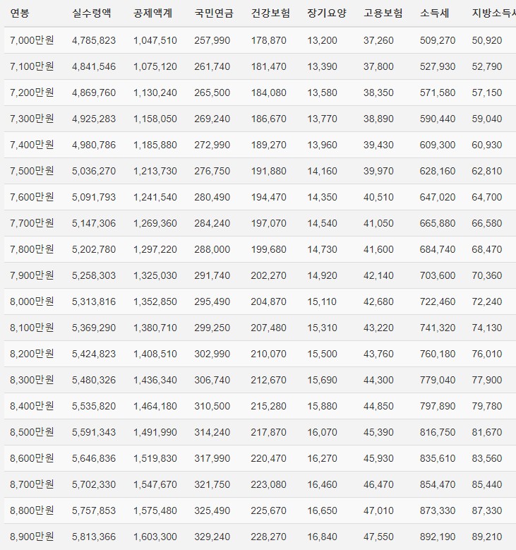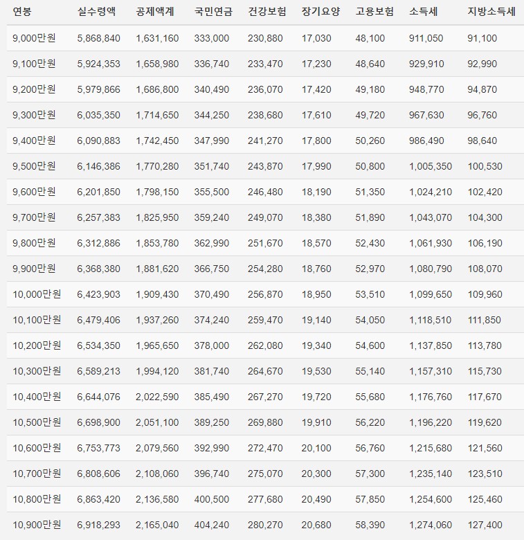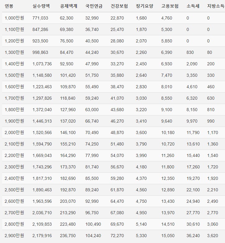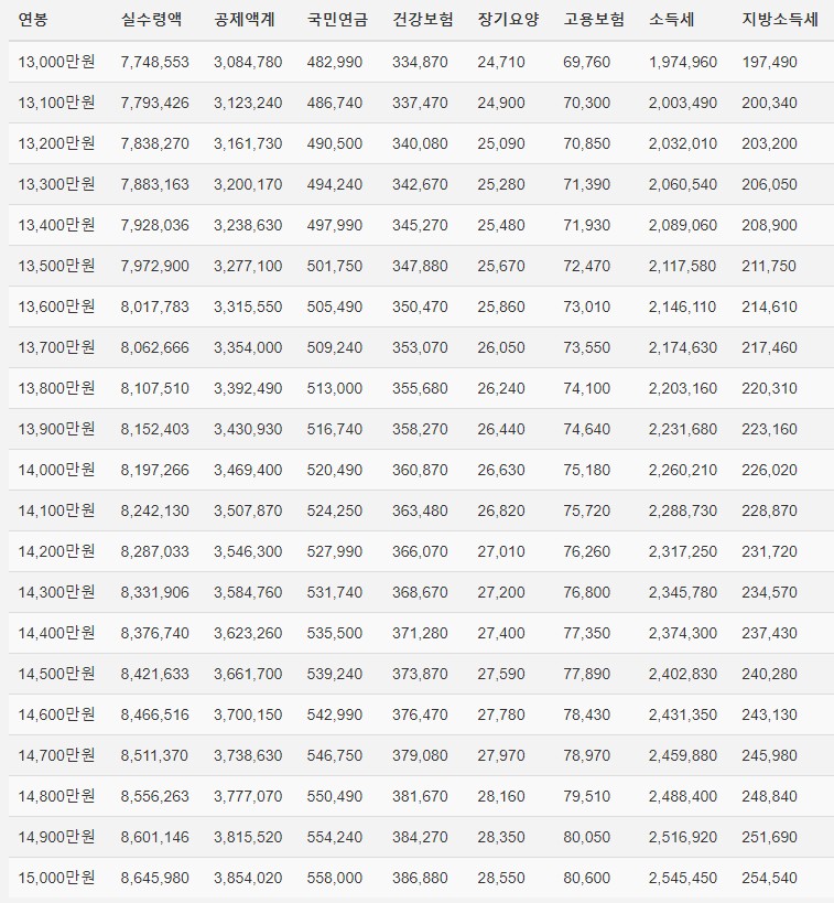 아래는 연봉 천만원부터 일억오천만원까지의 실수령액을 표로 나타낸 것입니다. 표의 가장 왼쪽에는 연봉과 연봉을 12개월로 나눈 월급 등의 공제 항목이 기재되어 있으며, 가장 오른쪽에는 공제 금액과 실수령액이 표시되어 있습니다.
